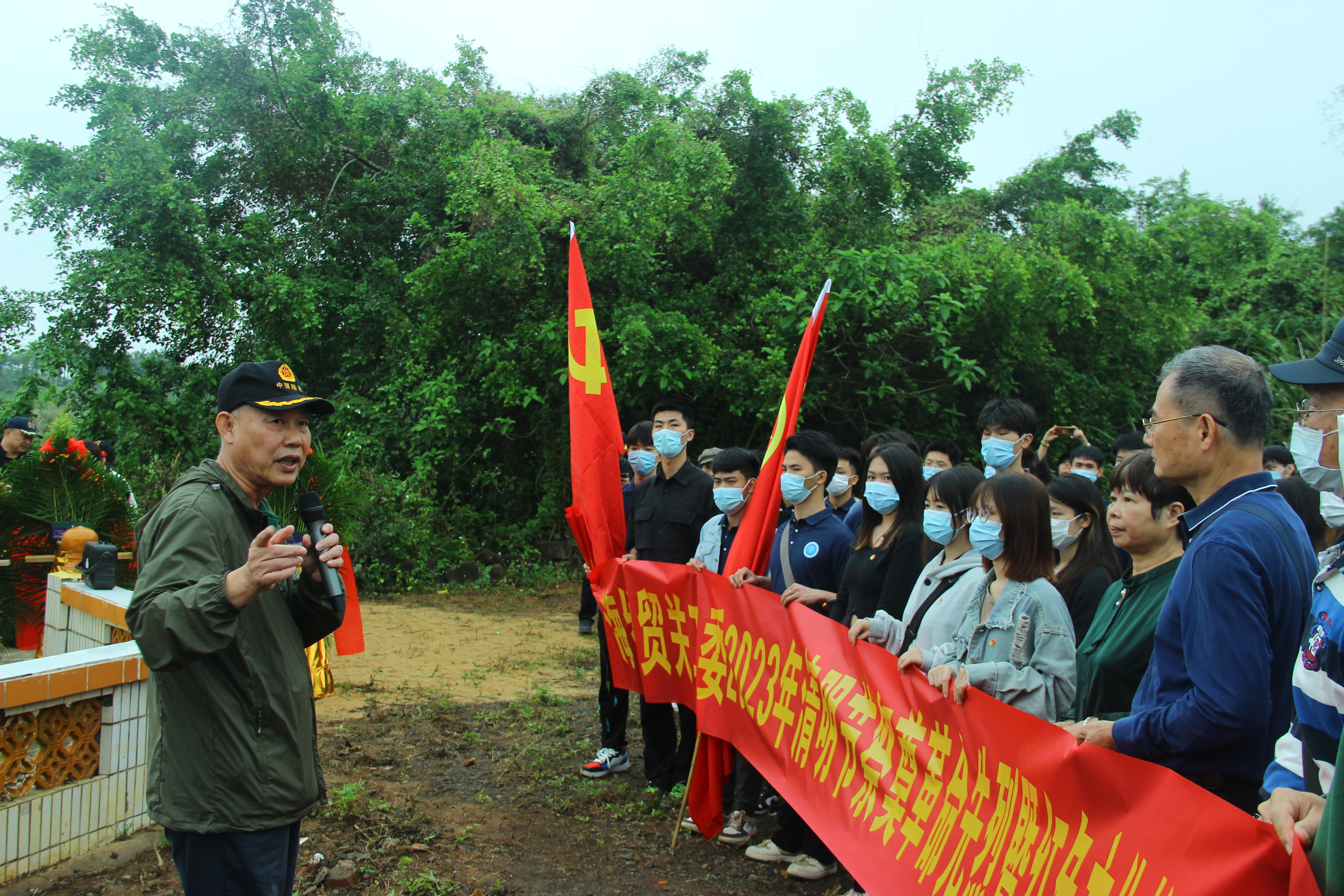 升旗活动结束后,员工党支部一行人步行前往了黄竹小学附近附近的无名烈士墓,进行祭奠活动。在无名革命烈墓前,大家有序向先烈敬献鲜花,深情鞠躬,默哀,哀悼亡故英灵。随后,四野后代、美亭大决战研究会会长傅清扬老政委在活动现场,为大家详细讲述了解放海南战役美亭大决战的历史过往,通过战役中一个个激烈的战斗典型故事,以讲故事的方式带领同学们全面回顾了中国共产党的百年历史,就是领导和团结全国各族人民从救国、建国、富国到强国的奋斗历程,让员工们更直观地感受党的艰苦岁月和峥嵘历程。