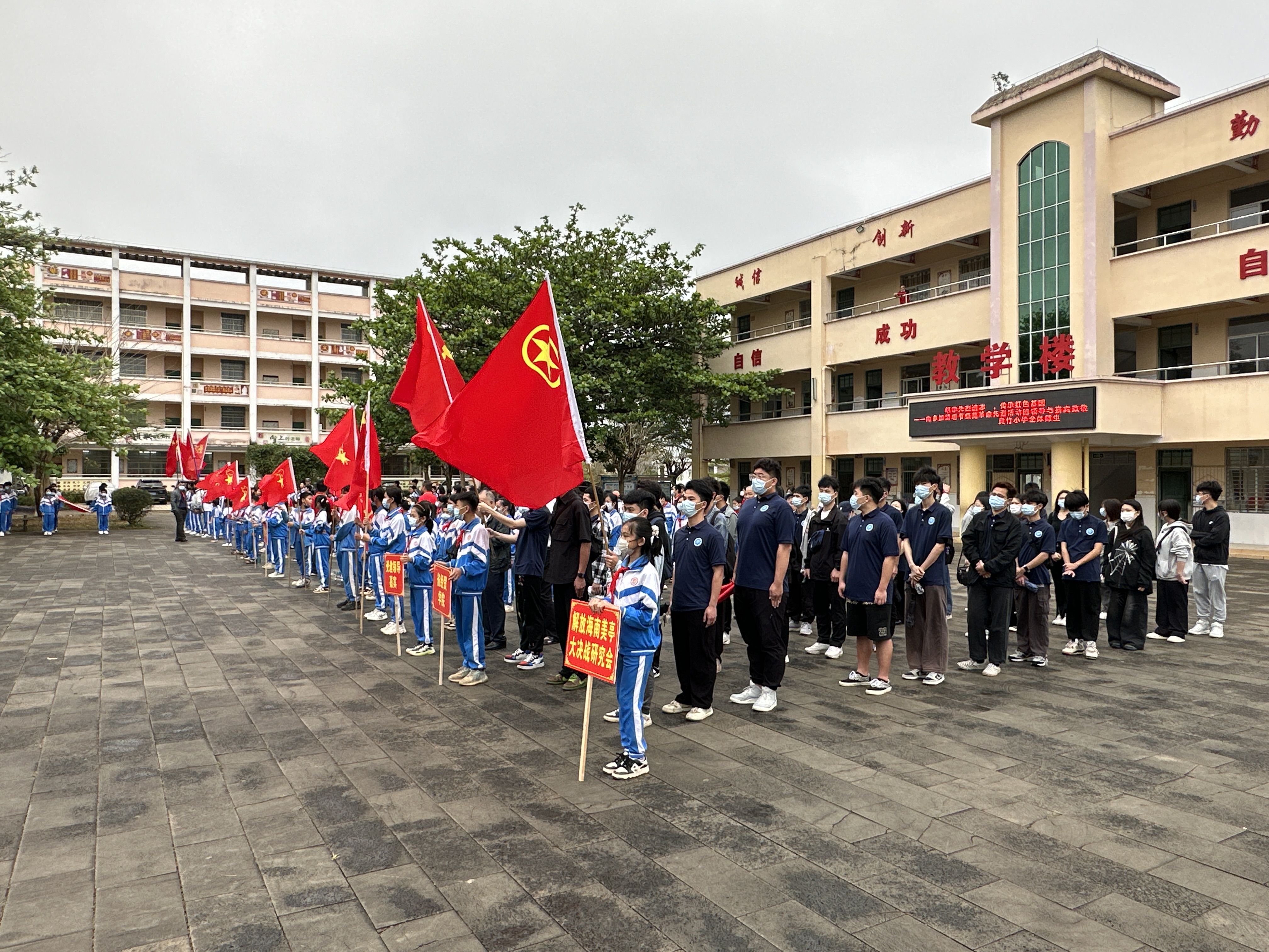 上午九时整,细雨蒙蒙,2023年清明节祭奠革命先烈主题升旗仪式在黄竹小学操场正式开始。黄竹小学国旗护卫队的队员们迈着稚嫩而有力的步伐,护卫着国旗走向升旗台。伴随着《义勇军进行曲》慷慨激昂的旋律,鲜艳的五星红旗冉冉升起。在场的全体人员肃然起敬,面向国旗行注目礼,齐唱国歌,共同祝福伟大祖国更加繁荣昌盛、美好和谐。