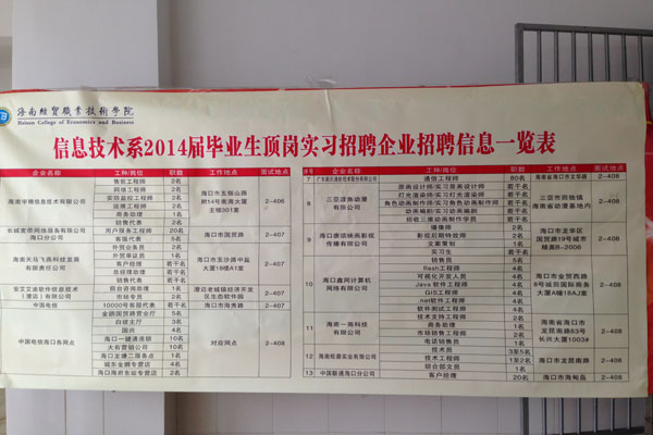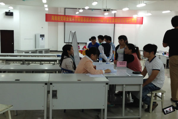 我系于11月5号在教学楼二栋406、407、408三个大教室成功举办了2014届员工顶岗实习专场招聘会。海南宇穗信息技术有限公司、长城宽带网络服务有限公司海口分公司、海南天马飞燕科技发展有限责任公司、安艾艾迪软件信息技术(澄迈)有限公司、中国电信10000号客服代表、中国电信海口各网点、三亚涯角动漫有限公司、海口唐颂映画影视传播有限公司、海口鑫网计算机网络有限公司、海南一商科技有限公司、海南炬鼎实业有限公司、中国联通海口分公司等12家企业参加了此次洽谈会。