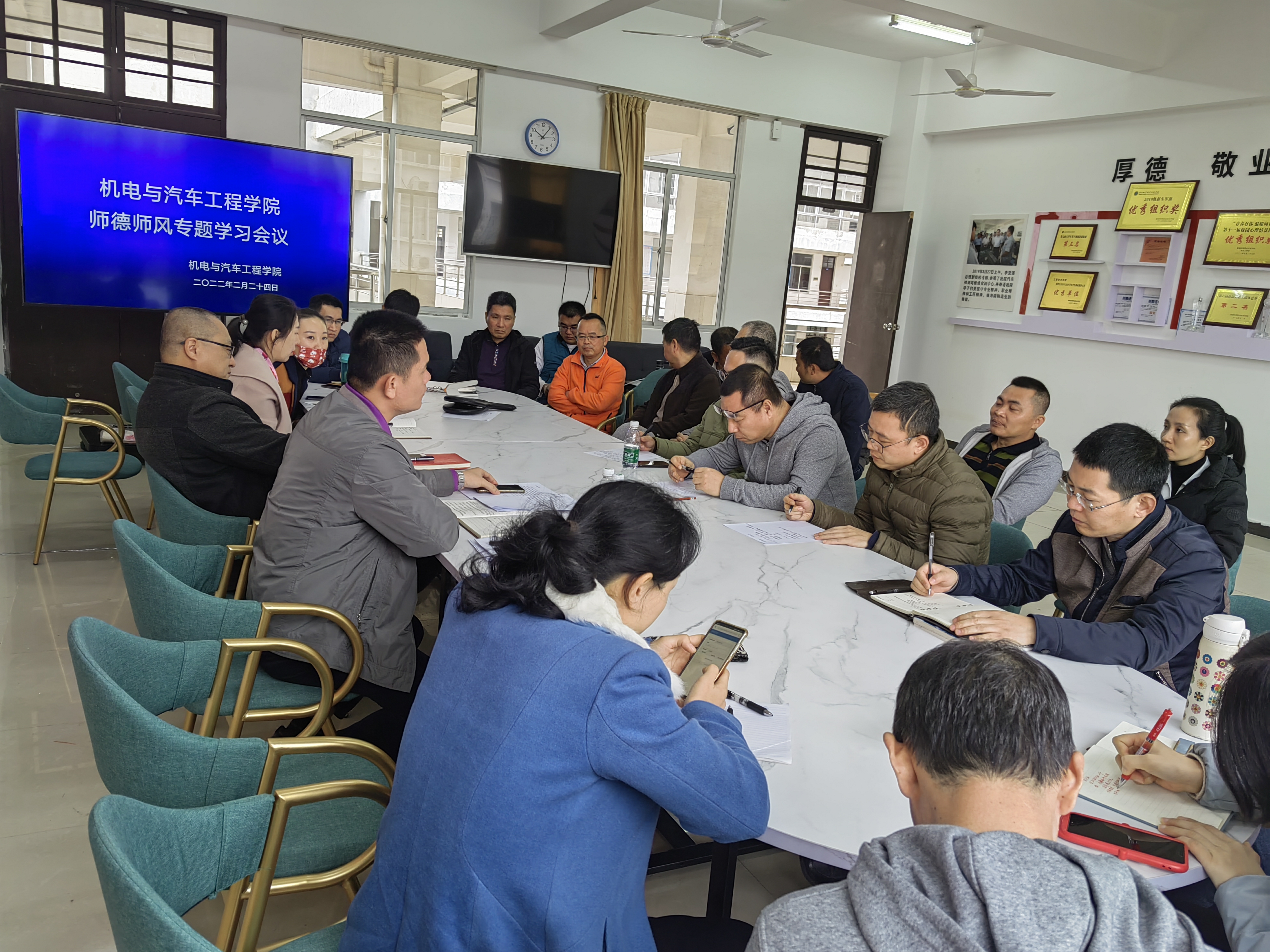 2月24日上午,公司在2-409会议室组织召开师德师专题工作会议,党总支书记范高智主持会议,全体教职工参会。