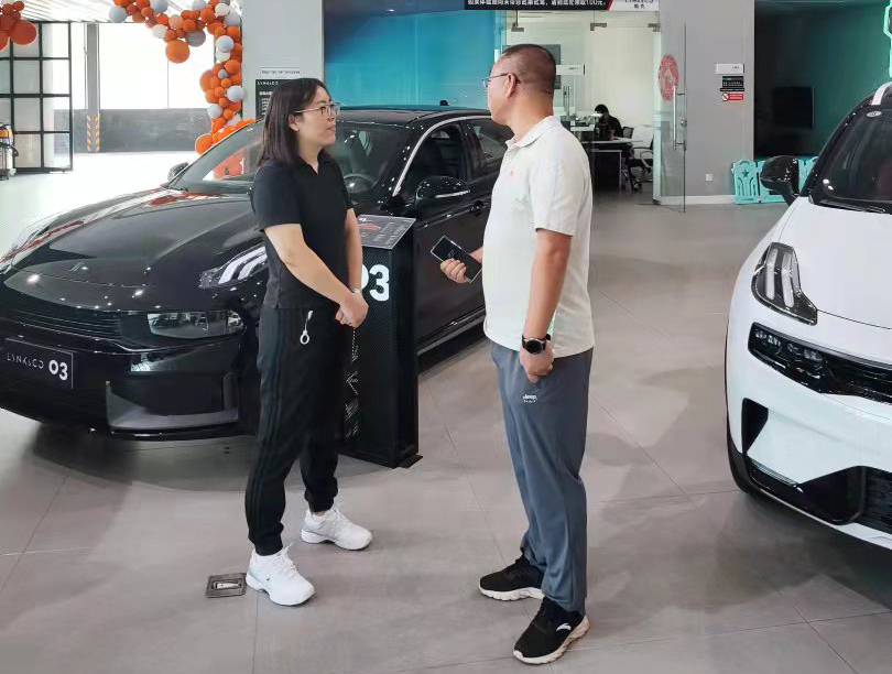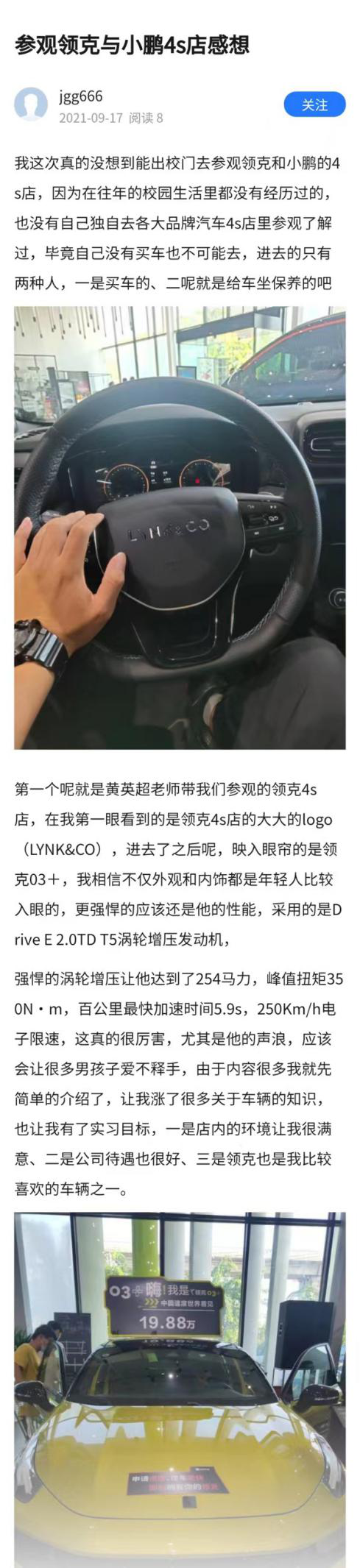 在合沃展厅内,销售部何子宁总监详细的给同学们介绍了领克品牌汽车的销售情况和销售员需具备的知识结构和技能素养。2020级正在店内顶岗实习的学长为员工们进行业务技能展示,介绍了领克产品的具体车型和参数并分享了实习的感受。