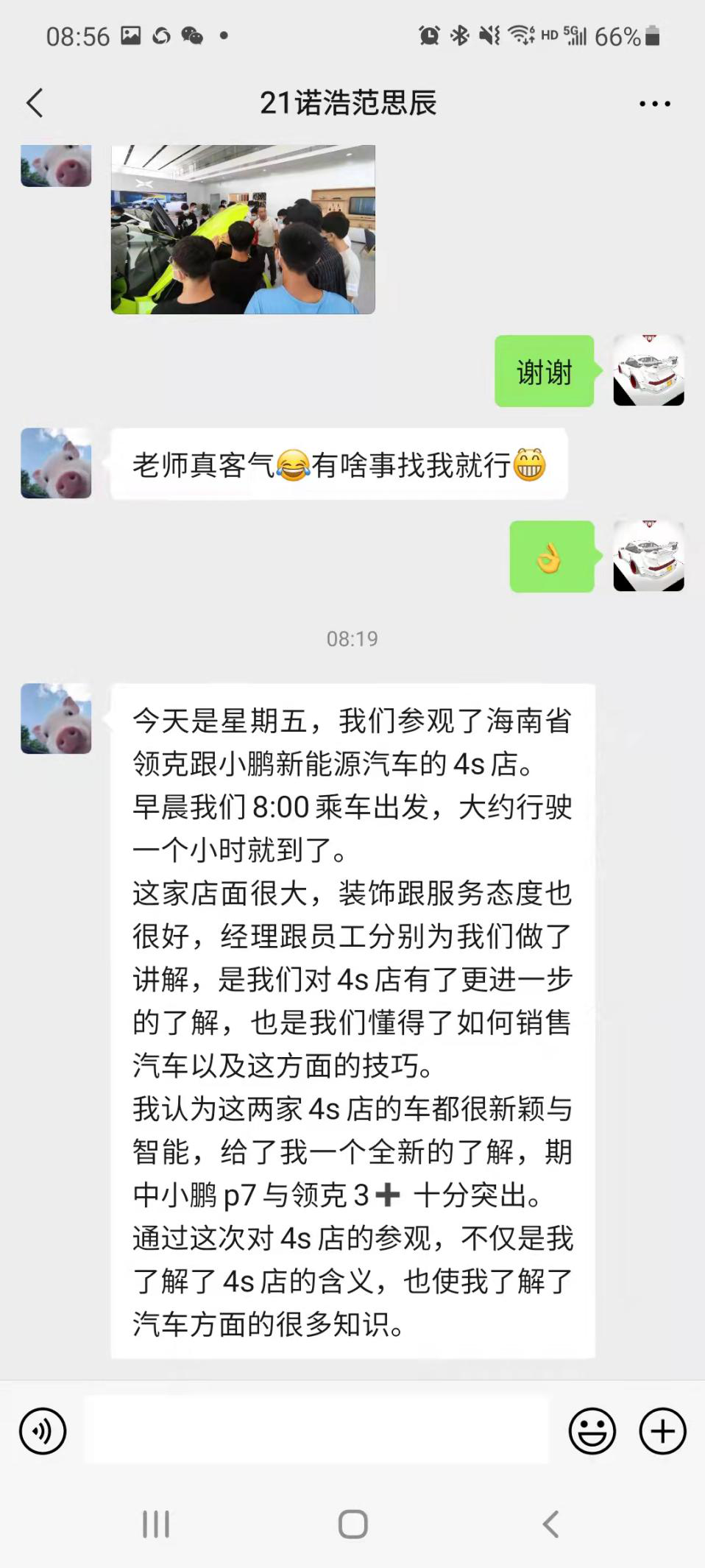 9月17日上午,2021级新生深入企业开展课程实践教学环节,在企业实际生产环境里上了生动的开学第一课。在海口合沃领克汽车体验中心,公司人力资源总监郭红女士为同学们讲解了领克的品牌理念、企业组织构架及员工培养及激励体制,并就同学们关心的实习就业和成长途径的问题进行了亲切交流。