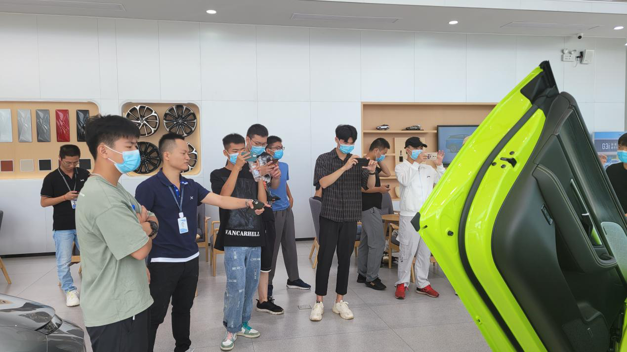 在小鹏汽车服务中心,售后服务部刘飞飞经理以学长的身份热情欢迎大家的到来,为同学们就小鹏品牌的发展战略及技术理念与优势做了详细的讲解,并带领同学们参观纯电动汽车售后服务车间。在车间,黄英超老师带领大家了解了维修车辆所用的各项设备和器材,并演示部分设备工具的使用方法和注意事项,结合生产实际对同学们的职业技能和职业素质的培养提出具体要求。