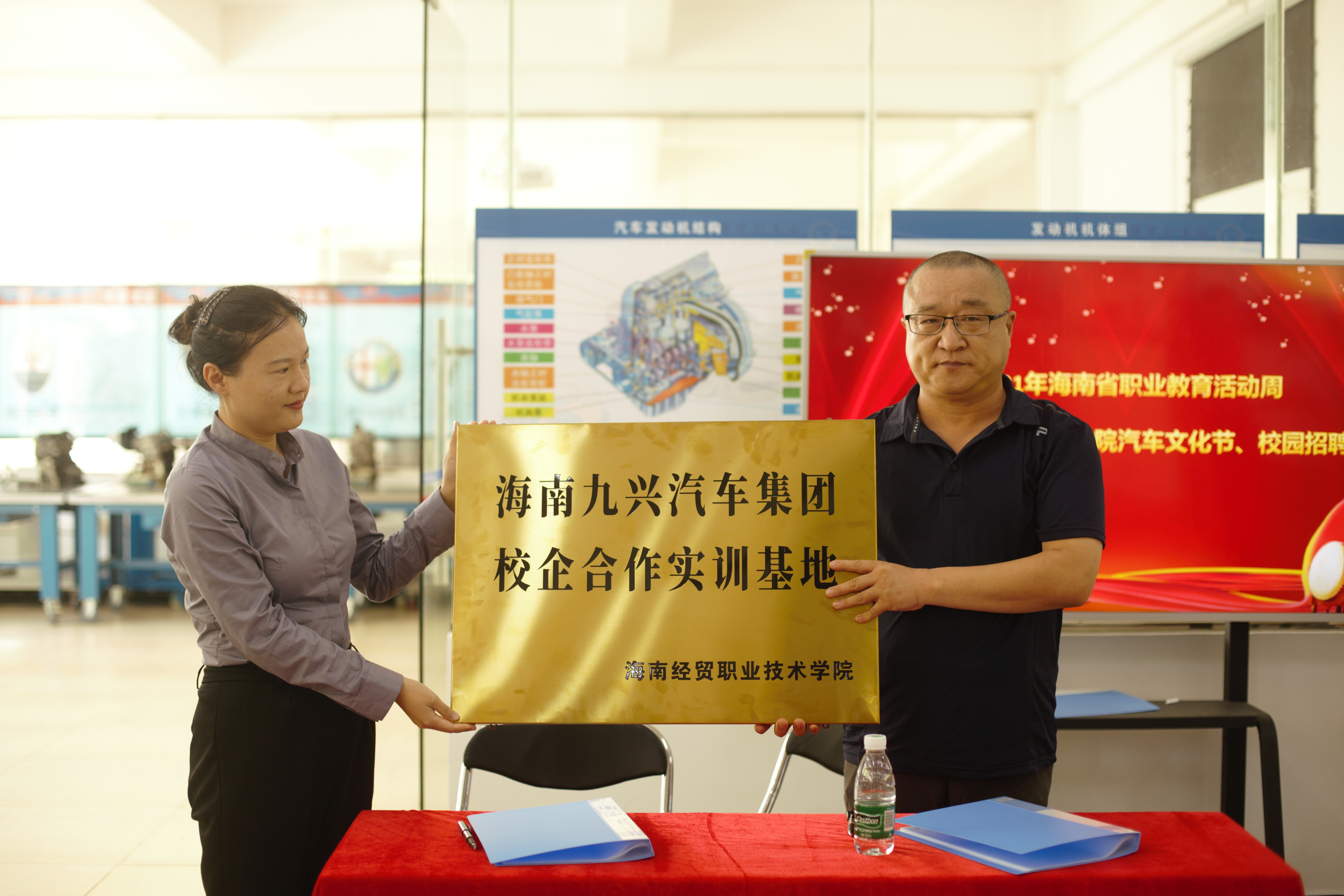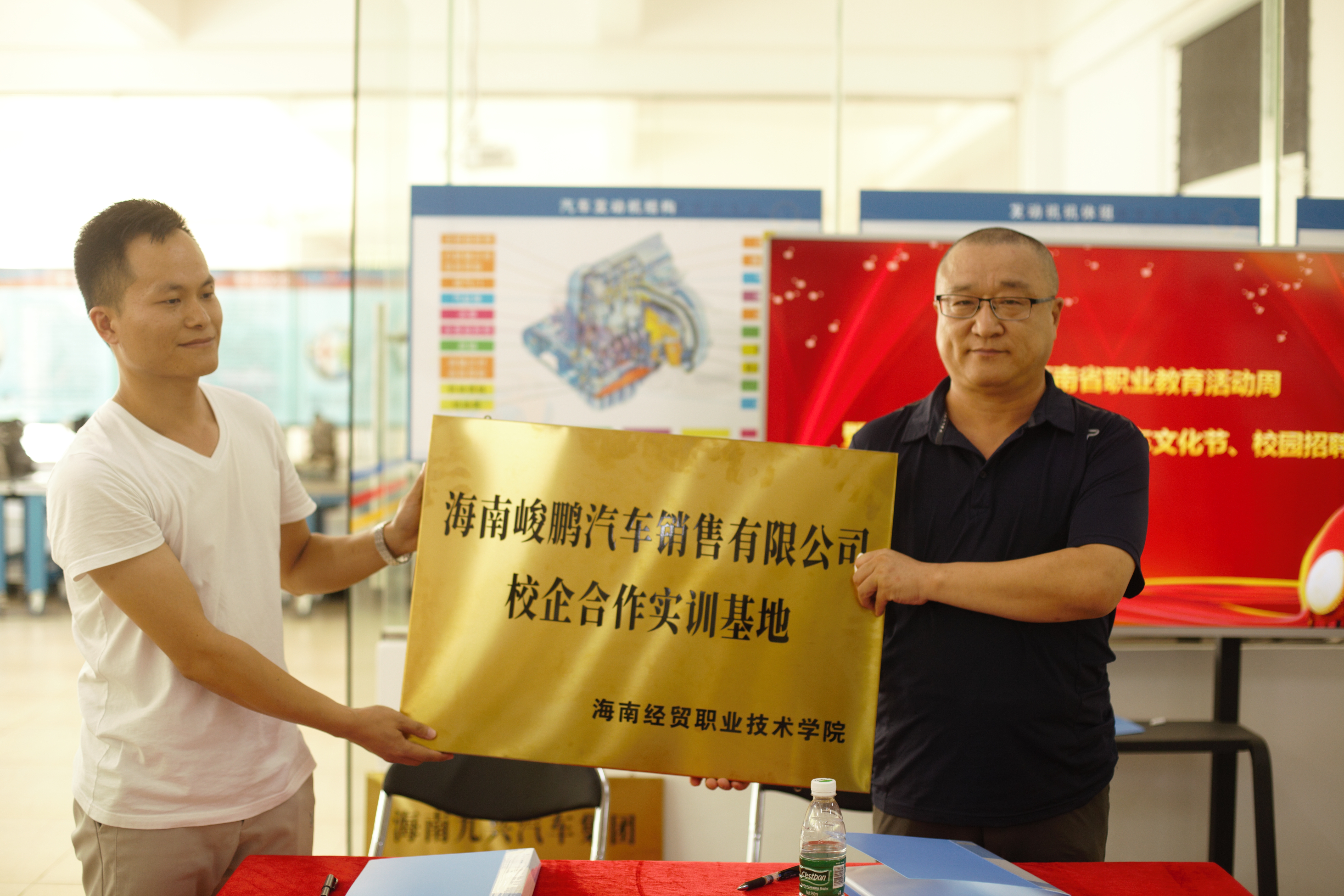 招聘会现场公司与海南峻鹏汽车销售有限公司和海南九兴汽车集团签订了校企合作协议,双方共同培养满足社会需求,以服务为宗旨,以就业为导向,以质量求生存,以创新促发展的产教融合教学理念。