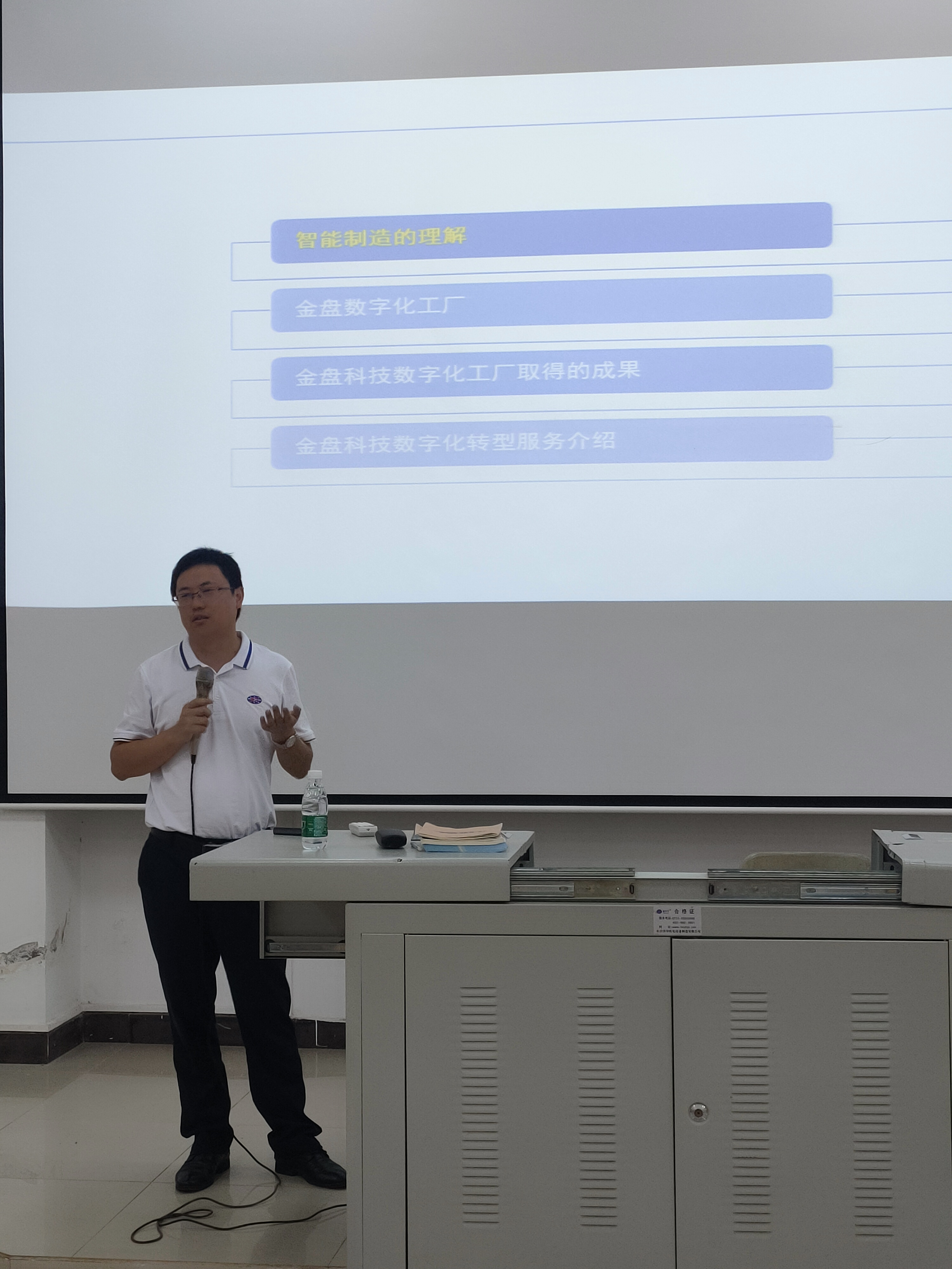 王荣旺总经理凭着自己在智能制造业积累的经验和丰富的阅历,给员工讲解及分析了随着工业变革,工业4.0时代的到来,传统工厂数字化升级转型,智能制造时代已经到来,并以海南金盘智能科技有限公司升级转型为例,给大家展示了现代数字化工厂的场景,同时欢迎同学们去公司实践。