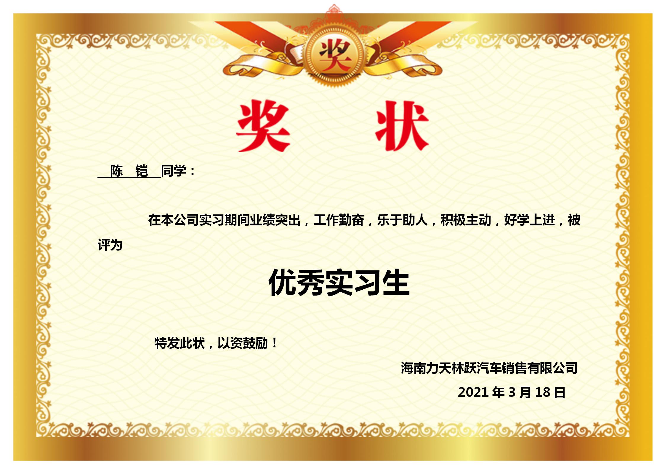 近日,公司2018级汽车检测与维修技术专业的陈铠、陈元新、罗能获得了海南力天林跃汽车销售有限公司(海南力天林肯中心)颁发的“优秀实习生”称号。 据了解,这三名同学在实习过程中,在各自工作岗位上勤奋好学,刻苦研究专业技术,多次受到实习单位的表扬,圆满完成实习任务,同时为公司赢得了荣誉。公司对以上三名同学提出表扬,希望他们以后的工作中更加出色,前程似锦,同时也希望所有的毕业生能够在实习工作中取得优秀成绩。