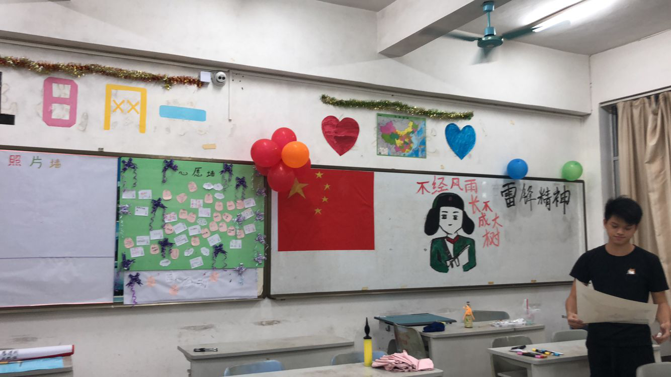 本班全部同学赶到帮忙,实到40人,各位积极热情的讨论自己的想法和思路。摆放位置和角度。有动手能力创意的同学在发挥自己的能力在布置的过程中,教室还停电跳闸了,每个人满头大汗,我急忙跑去电工值班室报修。各位真的辛苦啦!