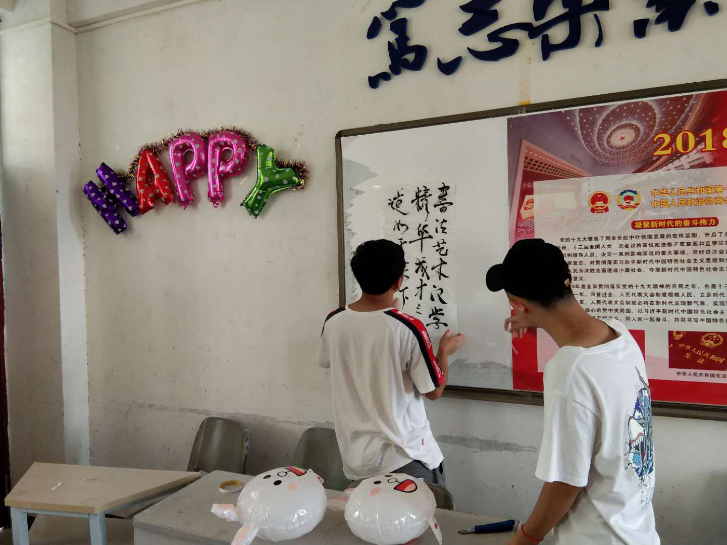 写字在同学们学习生活中是必不可少的,注意写字的正确姿势,使大部分员工能做到书写工整。墙上悬挂的名人名言书法卷轴是陈铭峰同学所写,展现出书法班级的特色。