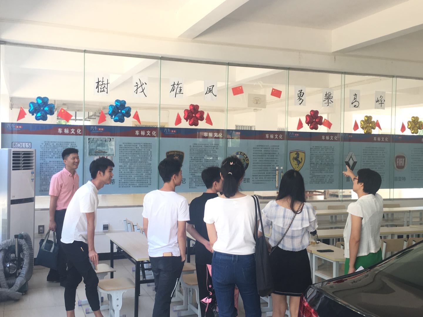参与本次考察工作的老师进入班级后,班级的负责人带领老师参观了整体班级建设,针对本班的文化及规划做了详细的介绍。五颜六色的彩笔、各式各样的气球、有趣的涂鸦、板报的丰富内容,经过同学们的共同努力,使宽敞明亮的教室瞬间变得生机勃勃,充满了活力。