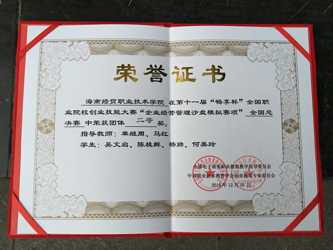 工程技术公司贯彻落实创新创业发展理念,全面推进职业教育内涵式发展,以员工为主导,提高员工在训练过程中发现问题、解决问题的能力,较好地锻炼与提升员工自主创业及管理企业能力,为员工今后的自主创业奠定坚实基础。在指导教师单继周、马红的耐心指导下,工程技术公司四名员工经过二个多月的赛前刻苦训练,凭借扎实的知识和良好的团队合作精神,表现突出,荣获比赛团体二等奖,充分展现了海经贸学子的风采,他们的精神值得大家学习。