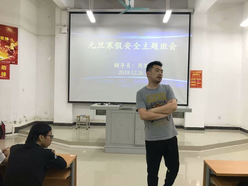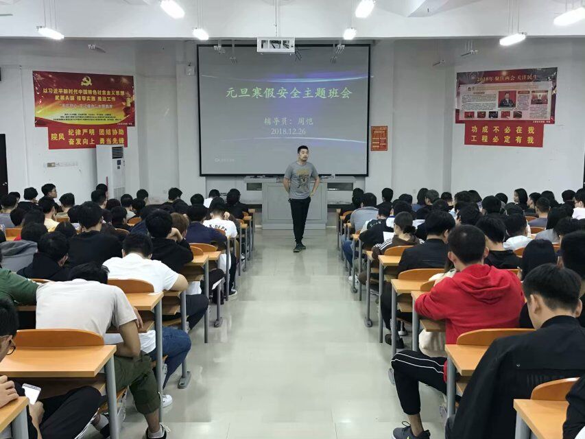 2018年12月26号晚(青年媒体中心报道)讯,公司在二教408教室积极开展了元旦寒假安全主题班会。本次会议由17级辅导员周恺主持召开,到场有17级全体员工。