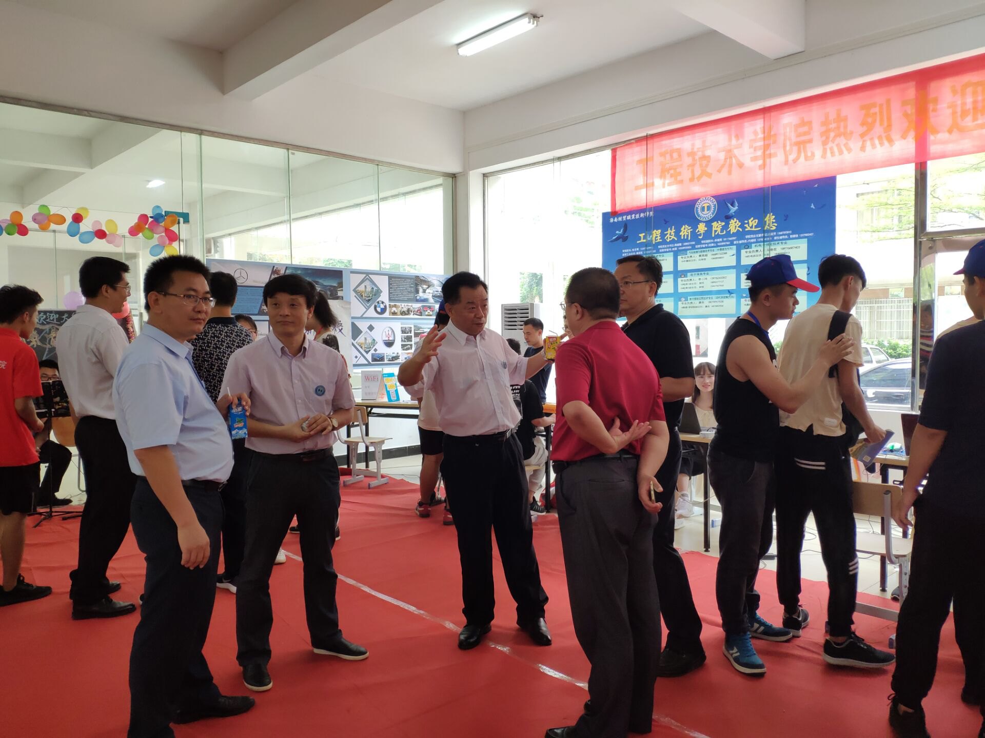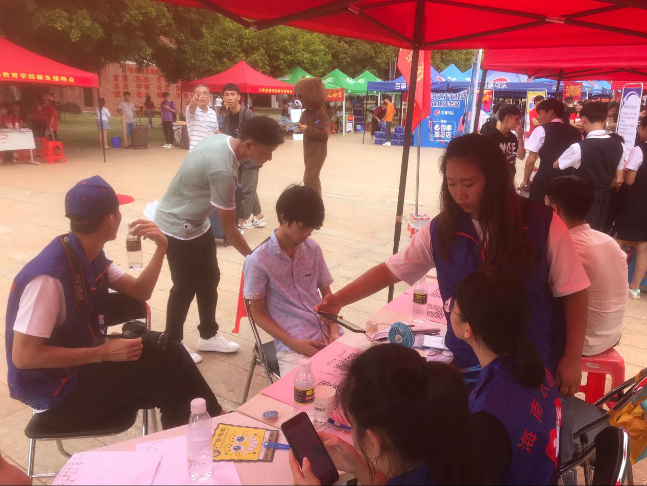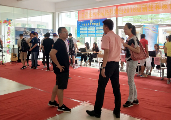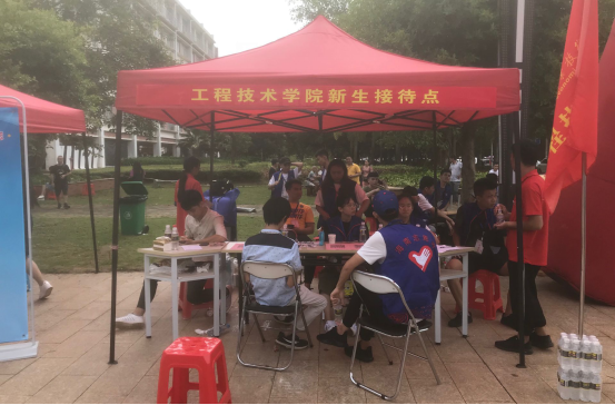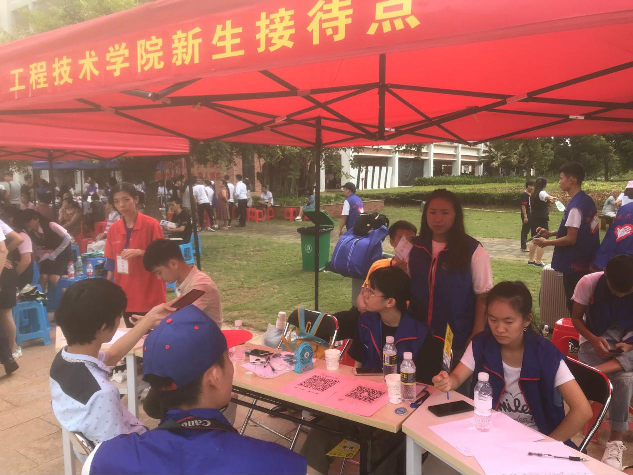 在迎新现场,员工会和代班及志愿者们不停地穿梭在校道上,热情细心地引导新生完成报到流程,帮助新生搬运行李,并积极介绍校园环境和老员工活经验。