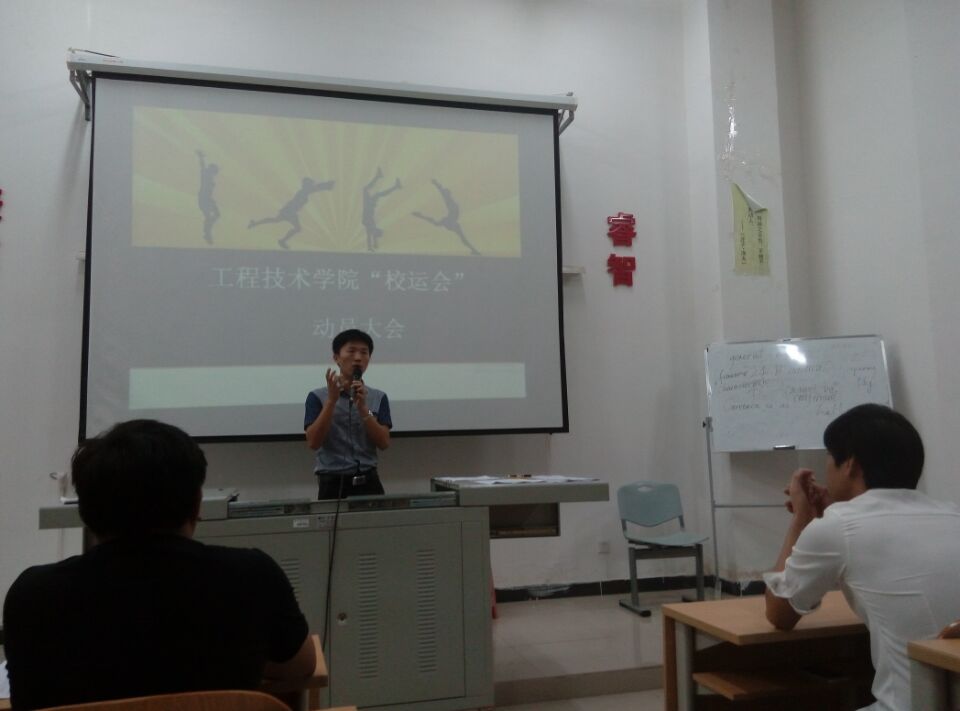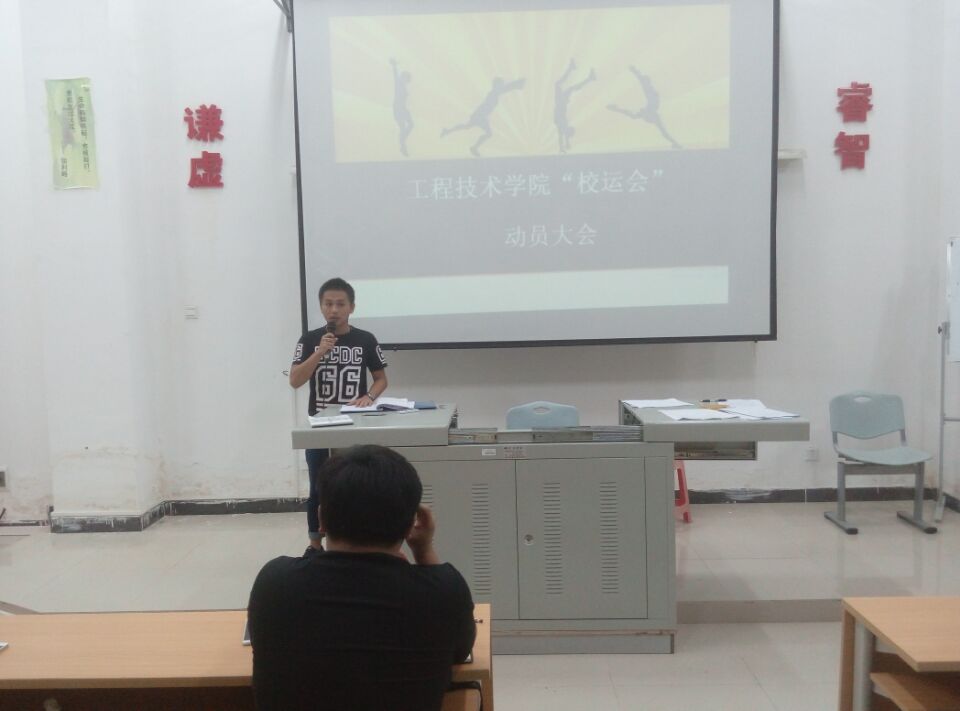 本次会议首先由文体部部长谢龙上台发言,他先讲述了本次校运会项目,团学青学员按捺不住的激动与兴奋,让场面一片躁动……“有问题请举手回答”,一句话,场面瞬间变得安静,并陆续的有人站起来提出想问的问题,并为他们一一作了详细回答。然后对本次参赛者要求是每个人可参加两个项目,最后他希望本次运动会大家都能自愿参加,并会给参赛者进行训练为校运会做充分准备。