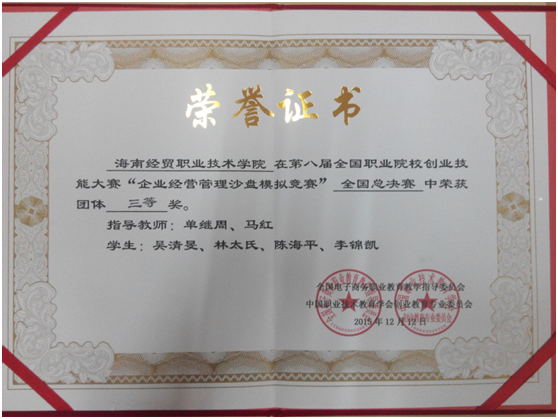 本院12月15日讯(电子商务李锦凯报道)“2015年第八届全国职业院校创业技能大赛企业经营管理沙盘模拟竞赛全国总决赛”在成都纺织高等专科公司举行。经过与来自全国121所院校共140支队伍的激烈角逐过程中,工程技术公司2013级电子商务专业员工吴清旻2014级电子商务专业员工林太氏、陈海平和李锦凯四名员工凭借扎实的专业知识和团队合作的能力荣获团体三等奖。指导老师是单继周老师和马红老师荣获优秀指导教师。