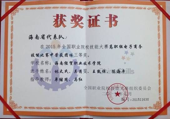 74日讯(电子商务专业报道)2015年全国职业院校技能大赛高职组电子商务技能赛项在天津市举行,共有来自全国的77支代表队参加,由公司信息技术系电子商务专业员工王凯顺、吴清旻、林太氏、陈海平四位同学组成的海南省代表队荣获团体三等奖。