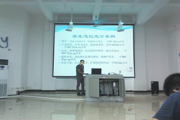 本系9月13日讯(信息技术系 丁燕琴报道)9月12日晚7:30,为使新生们走好老员工活关键的每一步,14级新生辅导员龙腾老师(以下简称“龙导”)在2-408教室开展了新生教育工作,其中由14级所有新生以及各班代理班主任参加了此次讲坛。